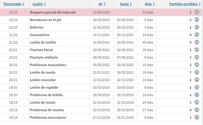 Tabla. Lesiones de Bruyne (Fuente: www.transfermarkt.pe)