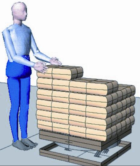 - Otro ejemplo más común es el paletizado al final de una línea de producción, en donde los operarios apilan y acomodan los paquetes sobre una parihuela para posteriormente ser almacenados. Los operarios pueden realizar esta actividad de pie o sentado procurando buscar su comodidad y cumplir los objetivos de producción, sin tomar en ciertos cuenta, las medidas de seguridad. Encontramos diferentes factores que afectarán negativamente en su salud, por ejemplo: La frecuencia de manipulación de los paquetes, la forma de armado del pallet, la naturaleza del producto que se manipula, el número de operarios, etc. Aquí, la aplicación de la antropometría es ayudar al diseñador a determinar las dimensiones requeridas para este puesto de trabajo. Por ejemplo: la altura en que se manipulará los paquetes, el número de filas por pallet, la altura del asiento de la silla si se realiza de manera sentada, una mejor selección de la ayuda mecánica, entre otros.