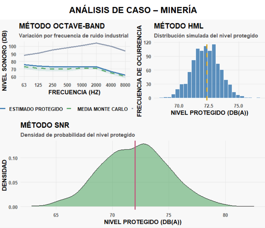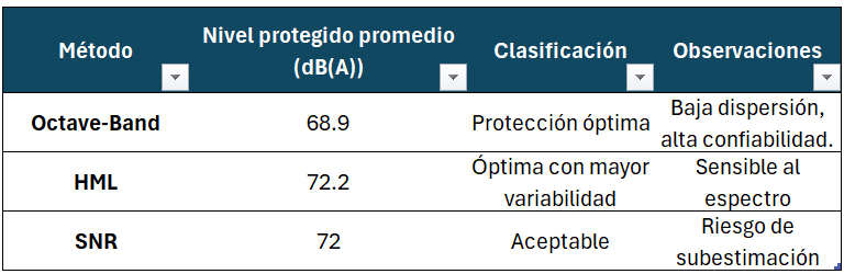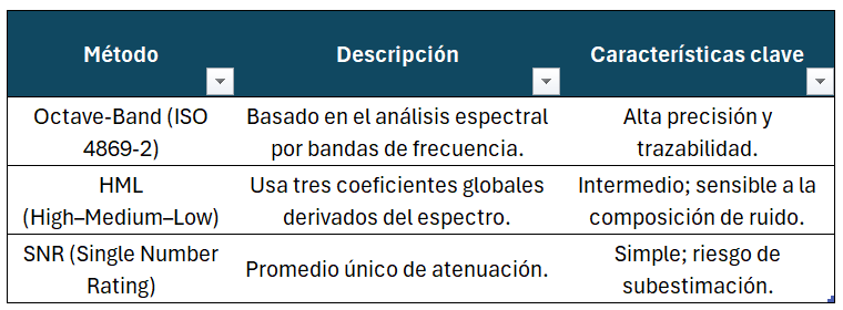 - El método importa. SNR, HML y Octave-Band no son equivalentes; cada uno puede alterar decisiones clave sobre EPP o exposición residual.