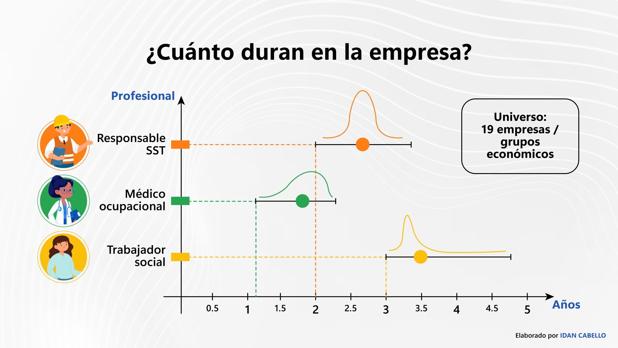 La permanencia del Profesional SST sigue una distribución normal Gaussian, la del médico parece ser una Beta, y la del Trabajador Social una de tipo Log Normal.